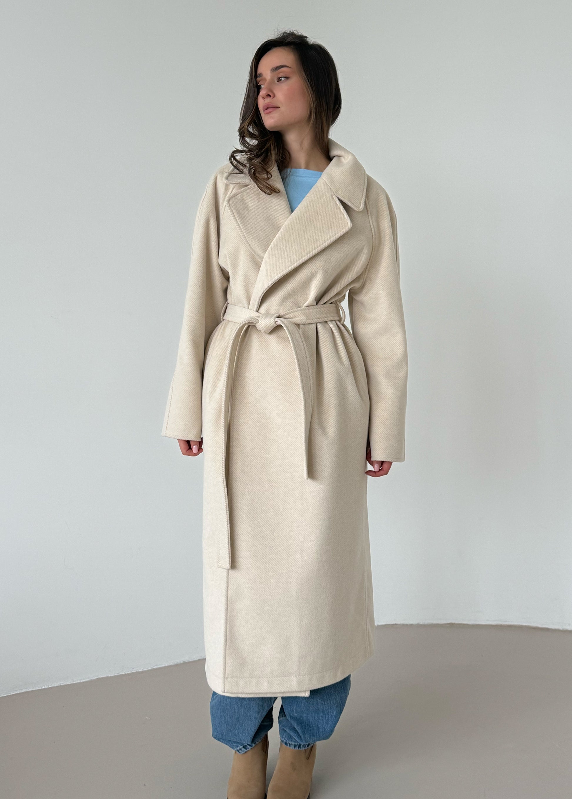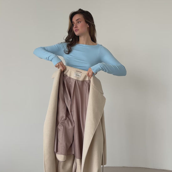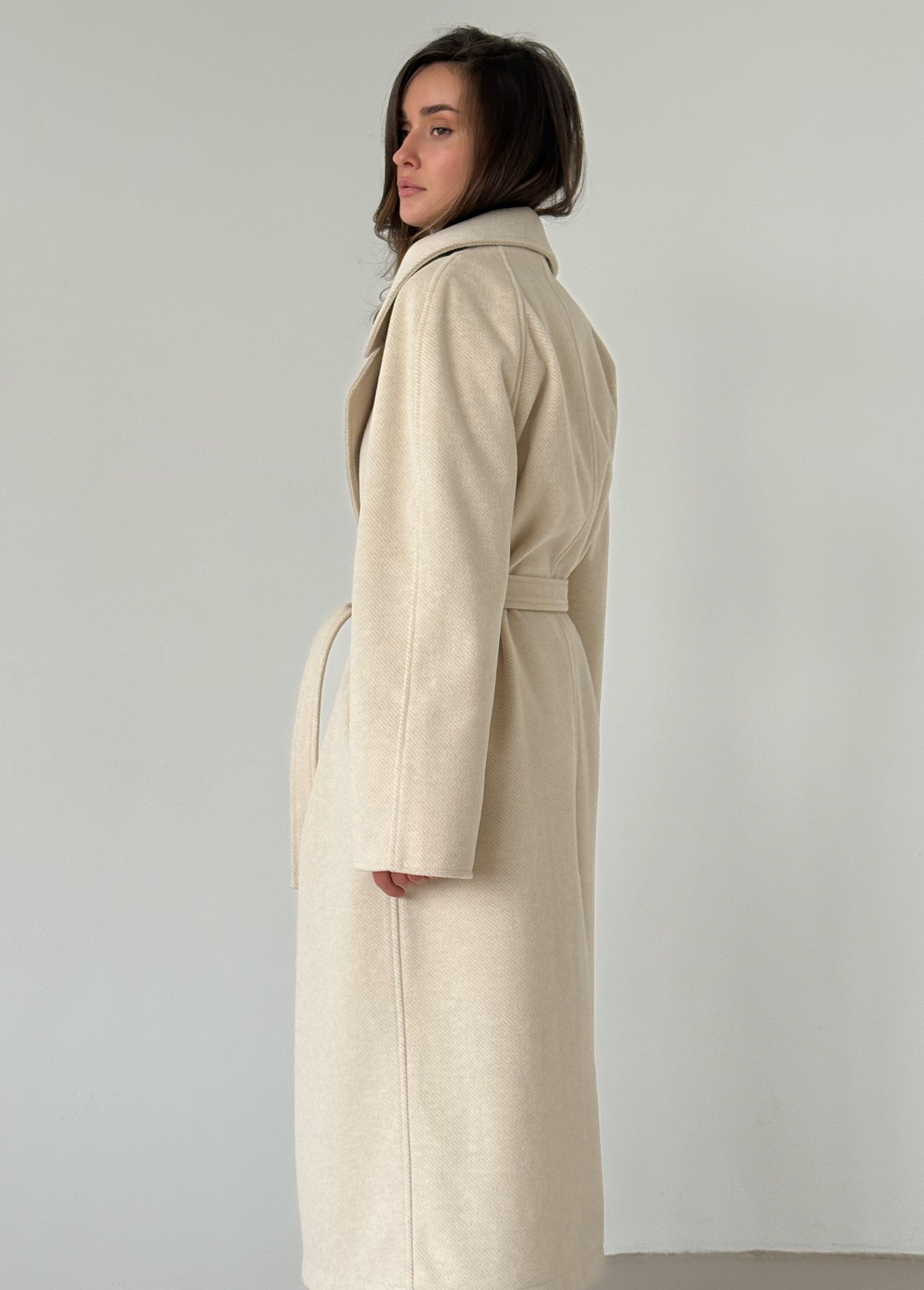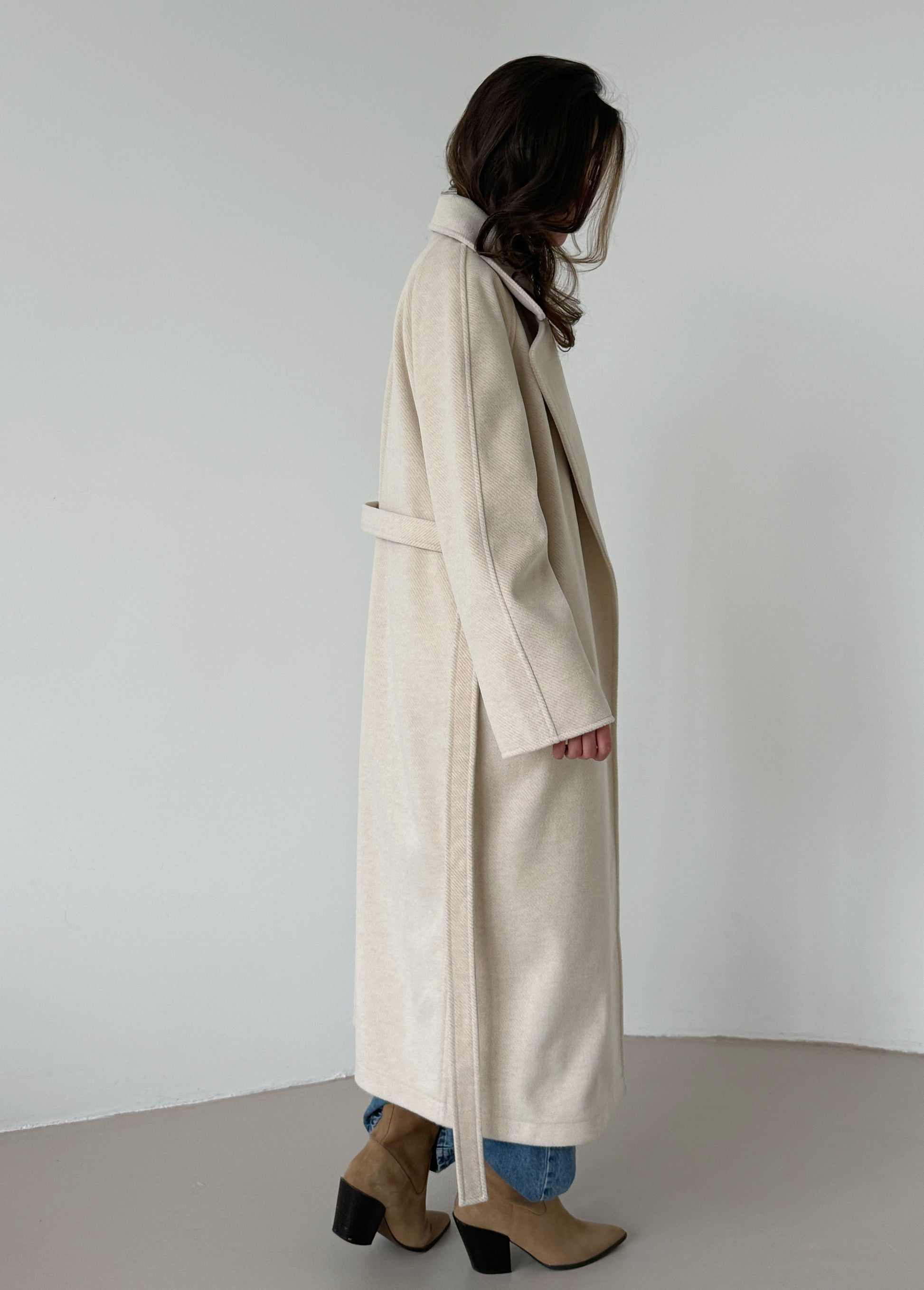 An elegant cream wrap coat designed in a minimalist robe-style silhouette. The soft structure and adjustable belt create a flattering shape while maintaining a relaxed and comfortable fit. A timeless outerwear piece that pairs easily with both casual and refined looks.