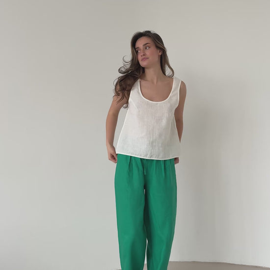 Loose-fitting green linen trousers with a relaxed baggy silhouette. Made from breathable natural fabric, they provide comfort, airflow, and an effortless everyday look.