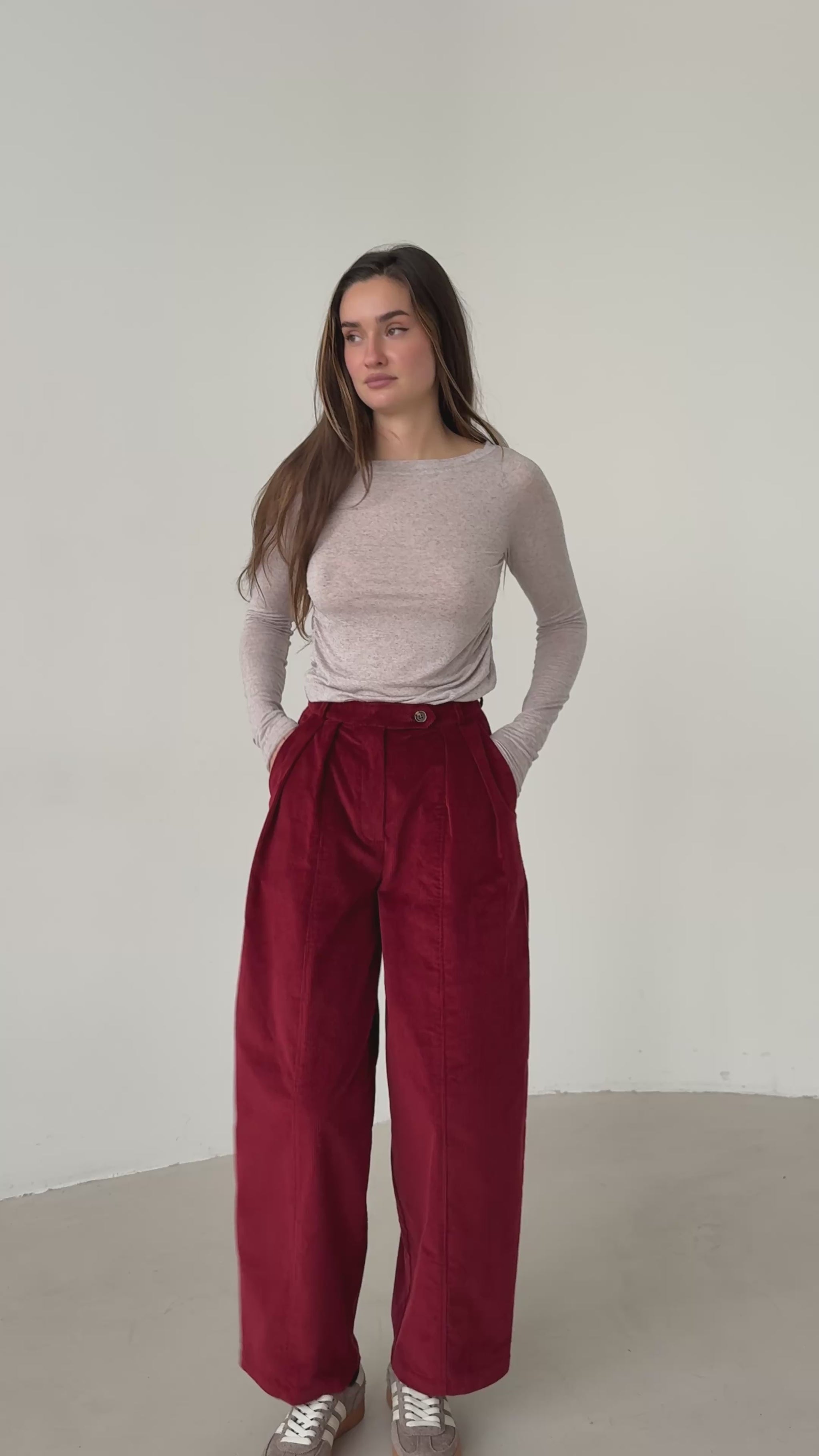 Baggy corduroy trousers in a rich raspberry shade, designed with a classic fly closure. The relaxed silhouette and soft textured fabric make them a comfortable yet stylish choice for everyday wear.